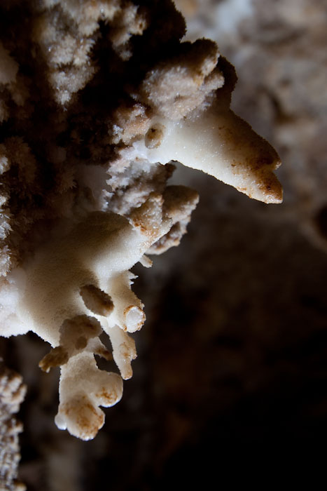 Pa spet fotkanje nad enim izmed brezen,… pa fleš ne dela, potem ne dela daljinski prožilec za fotoaparat, pa potem zataji eden od brezžičnih prožilcev za fleš… dogaja se toliko, a vse v slabo smer, še dobro, da nisem kar zajokal, ko ni delovalo… no, saj verjetno bi, če bi bil v jami nekje daleeeeeeč od doma, tako pa je možen ponoven obisk 🙂 No, po začetnih težavah (vedno so, z vso opremo, v skoraj vsaki jami, pa se še vedno nisem navadil), pa so potem fleši bliskali kot nori… In potem, pri enem fotkanju vstanem, pokrovček objektiva sem seveda odložil nekam nase,… Preden sem dojel, kaj ropota ob meni in pogledal v smer ropota, sem lahko samo še občudoval, kako elegantno se je pokrovček odpeljal proti razpoki in… seveda kakopak… izginil vanjo. Kar nekaj časa se je še slišalo poskakovanje in odbijanje plastike od skal… In že sem pri sebi odšteval 10€ za nov pokrovček, si bom pač na naslednjem potovanju privoščil kakšno pivo manj 🙂