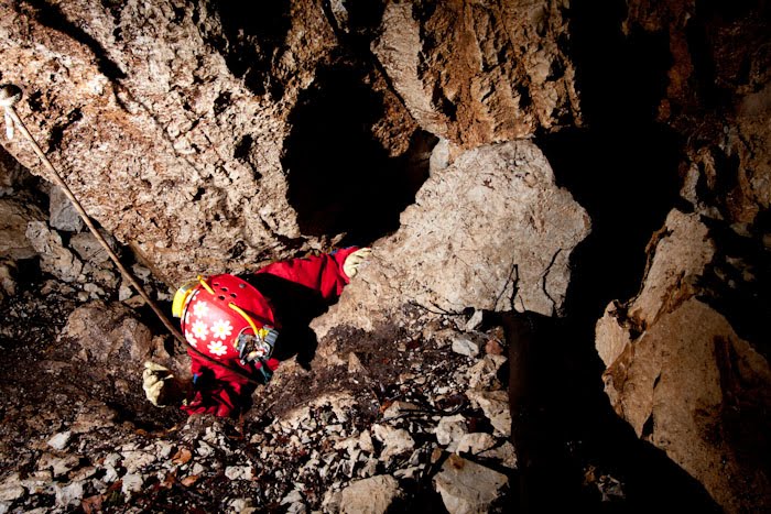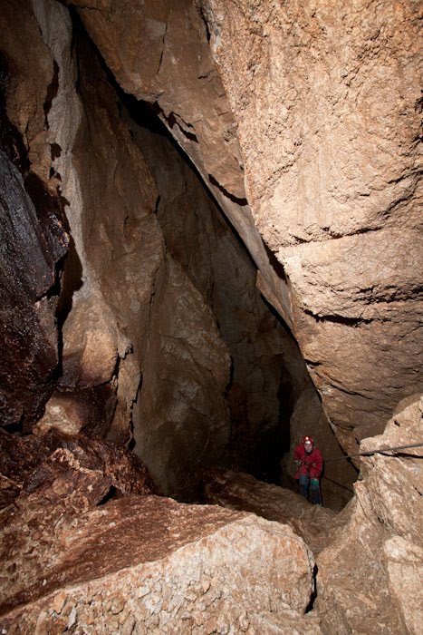 Walter se spusti prvi, ostali pa čakamo na znak iz jame, da je prosto. In potem en za drugim počasi capljamo do dna vhodnega brezna. Ko si enkrat na dnu, se stisneš v kot in čakaš. Zakaj v kot?! Tudi najbolj izkušeni sem in tja sprožijo kakšno skalico, skalo… in ni nič prijetno stati sredi brezna, ko nad seboj zaslišiš ropot, zato se veno stisnemo nekam. V Klomskem breznu pa sploh… sicer je nadaljevanje možno, vendar počakamo, da smo vsi na dnu vhodnega brezna, ker bi bilo tlačenje skozi ožinico še bolj adrenalinsko in nevarno, saj vse sprožene skale letijo naravnost vanjo in na tistega, ki bi bil v tistem trenutku notri.