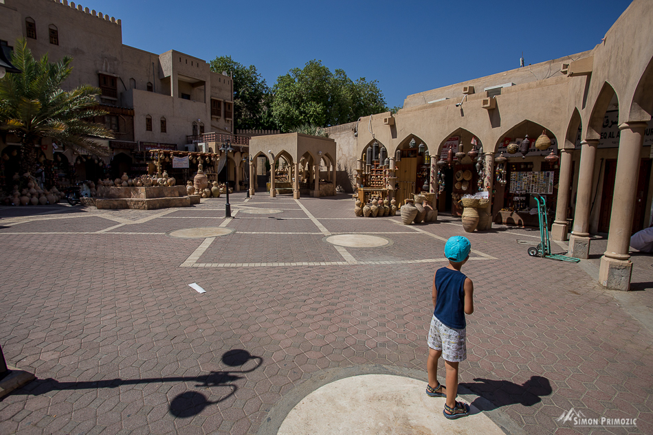 V Nizwi smo se ustavili predvsem zaradi kartic, katere običajno pošiljamo nazaj domov – a je bila tržnica prazna, trgovinice zaprte, … Le eno smo našli, v kateri smo jih nekaj nakupili, mali pa je v dar dobil še značko v obliki ozemlja Omana in v barvah njihove zastave. Sicer pa je stric trgovino zaprl takoj ko smo jo mi zapustili. Kartice smo popisali ob srebanju prve kavice v Omanu, ki pa je bila instant in presneto draga – ostale gazirane zadeve pa so v tem arabskem svetu zelo, zelo poceni.
