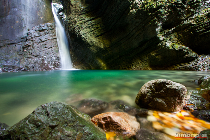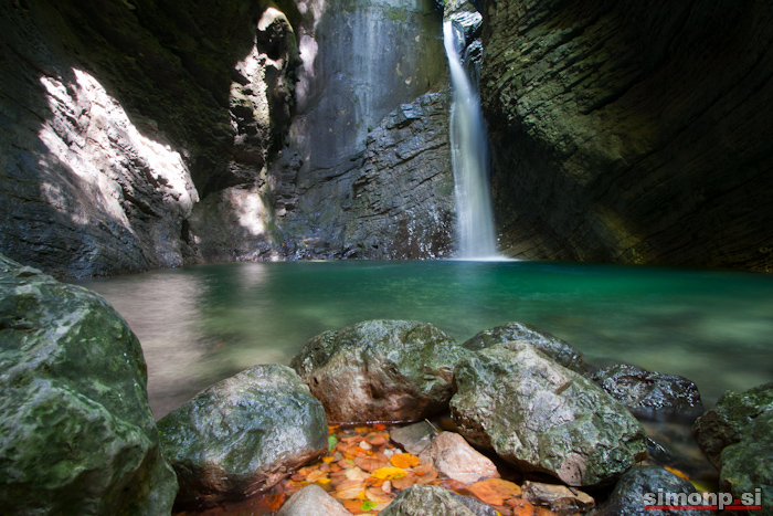 K sreči ob najinem prihodu pri slapu ni bilo preveč ljudi, čeprav sva jih pričakovala glede na avtomobile parkirane na izhodišču… Tudi tisti, ki so bili, so se počasi odpravili nazaj, midva pa iz lesenega podesta po drsečih skalah navzdol do tolmuna, namestila fotoaparate na jobo stojala in hitela s škljocanjem 🙂
