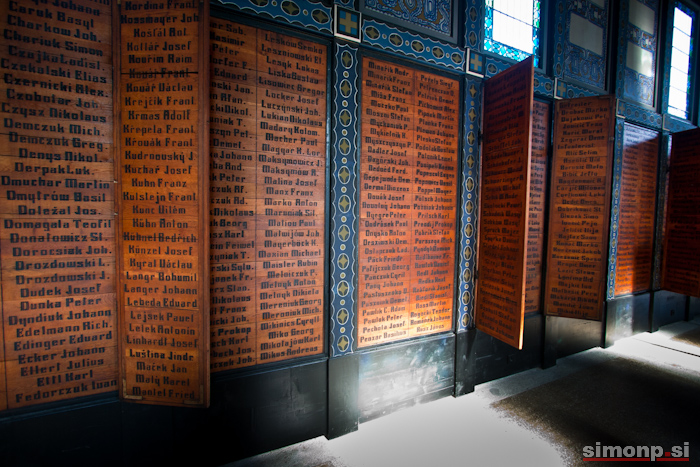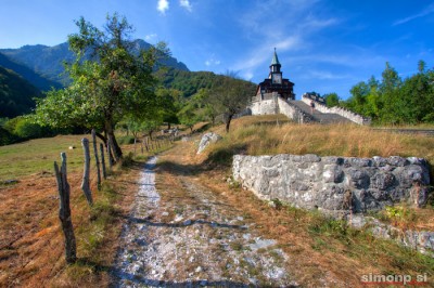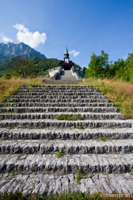 Gasa po cesti proti Tolminu, pa potem malo lutanja – v osnovi imajo tod okoli slabo označeno, ko pa enkrat zapelješ v pravo smer, potem je pa tako dobro označeno, da sigurno ne zgrešiš 🙂 Od Zatolmina še cca. 8 kilometrov adrenalinske vožnje po ozki, ponekod prepadni cesti, kjer parkirava jeklenega konjička in jo sopihneva v breg proti Javorci. Spominski cerkvi, ki so jo leta 1916 zgradili avstro ogrski vojaki v spomin na padle tovariše.